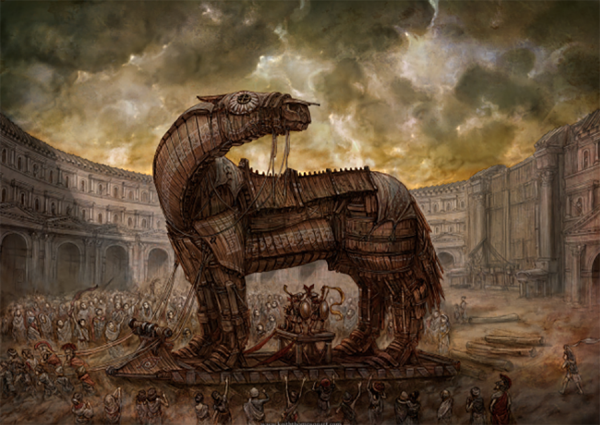 A história conta que um soberano ganhou de presente um enorme cavalo de madeira, como prova de amizade ou de trégua entre as disputas que os lados opostos mantinham. Acreditando em Papai Noel, embora não fizesse parte das tradições da época, ou por não acreditar que não existe almoço de graça, aceitaram o presente do inimigo e o colocaram no pátio do castelo. À noite, enquanto os soldados dormiam, de dentro da enorme barriga oca do animal saíram os soldados do bonzinho inimigo, matando-os em pleno sono e abrindo os portões para que o resto das tropas inimigas entrasse e liquidasse com o esperançoso e iludido soberano que tanto lutara para se defender. Essa alegoria chamada Tróia, pode tranquilamente servir de analogia a tantas coisas que estão subjetivamente contidas na nossa atualidade.