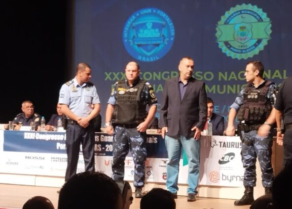 Esta semana, durante a abertura do XXXI Congresso Nacional das Guardas Municipais, em Porto Alegre, a Academia de Formação da Guarda de Alvorada foi teve seu trabalho reconhecido pela Associação dos Guardas Municipais do Rio Grande do Sul (Agmurs), com a Medalha de Destaque no ensino e formação dos profissionais de Segurança Pública. O comandante Guarda Civil, Moraes e o coordenador da AcadeGuarda, GCM Berthuline receberam a honraria.