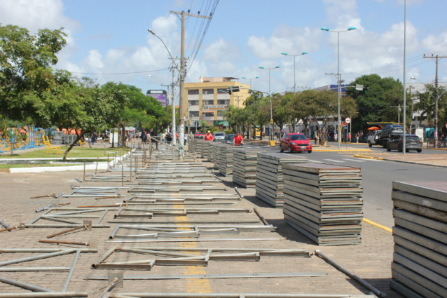 As estruturas metálicas, que servirão para montar as arquibancadas, foram erguidas ao longo desta tarde, assim como o palco e a estrutura dos camarotes. Equipes de limpeza também se mobilizaram ao longo do dia para podar as árvores, cortar a grama e pintar o meio-fio.