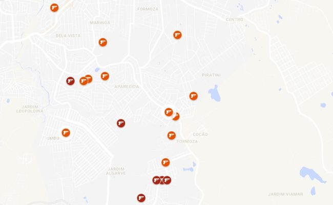 Apesar dos ícones no mapa abaixo não estarem indicando o local exato de cada morte, é possível dimensionar os bairros e regiões mais violentas. É o caso do Jardim Aparecida, que possui seis ocorrências, quatro delas de duplos homicídios. Se o medo faz morada, o endereço certamente é na rua A. J. Renner, onde seis pessoas foram mortas em três ocorrências distintas, uma a cada mês.