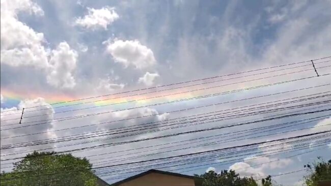 Foi possível observar em parte do Estado e também no Uruguai, nesta quinta-feira (23), a presença de um “arco-íris de fogo” ou, tecnicamente falando, um arco circum-horizontal, um fenômeno óptico raro que consiste de nuvens coloridas no céu.
