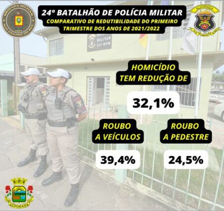 Conforme dados divulgados pelo 24º Batalhão de Polícia Militar (BPM) baseados nos números da Secretaria de Segurança Pública (SSP) do Governo do Estado, nesta segunda-feira (25), no primeiro trimestre de 2022, houve queda de 32,1% de homicídios no município, em comparação com o ano de 2021. Foram registrados 28 homicídios do ano de 2021, contra 19 do ano de 2022.