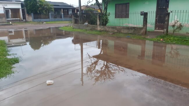 Os canos de escoamento do esgoto pluvial estão entupidos e principalmente na esquina das vias acontece acúmulo de água, que se agrava a cada chuva.
