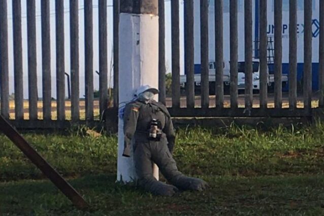 Um boneco vestido com a farda da BM foi amarrado a um poste e, na cintura, ele levava um artefato que levantou a suspeita de um explosivo. O manequim não possuía nenhuma inscrição e estava de boné.