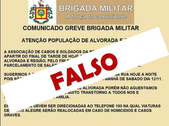 Em nota emitida na tarde desta sexta-feira (11) o comando do 24º Batalhão de Polícia Militar (BPM) desmentiu a postagem que circula nas redes sociais informando sobre uma greve da Brigada Militar de Alvorada. O falso documento é assinado pela Associação de Cabos e Soldados, que também confirma a mentira do comunicado.