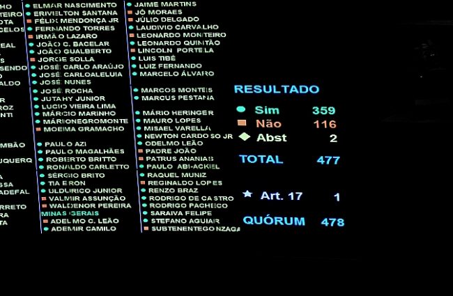 O texto principal foi aprovado por 359 votos a favor, 116 contrários e duas abstenções. Já a análise de seis destaques (sugestões de alteração ao texto original), contudo, foram todas rejeitadas.