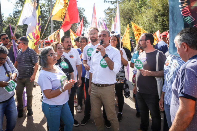 O candidato ao Governo do Estado, Edegar Pretto, da coligação Frente da Esperança (PT, PCdoB, PV, PSOL, Rede), participou nesta quinta-feira (8) de ato contrário à implantação da praça de pedágio na ERS-118, próximo ao trecho de acesso a Alvorada. Participaram do evento candidatos da coligação, além de empresários e moradores de Alvorada, Viamão e de outras cidades da Região Metropolitana.