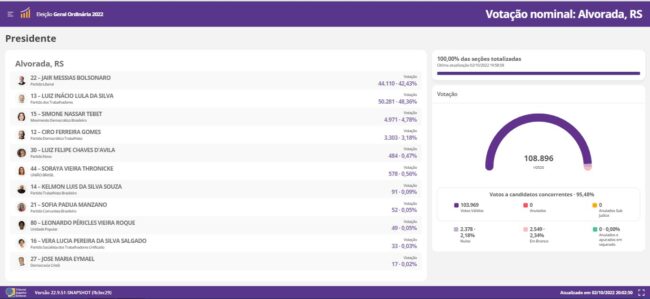 Ainda que o resultado das eleições tenha apresentado os números dos candidatos em nível nacional colocando no segundo turno à Presidência o ex-presidente Lula (PT) com 56.492.923 voto, 48,21%% e o candidato à reeleição, Jair Bolsonaro (PL) com 50.843.531 votos, 43,39%; em nível estadual para o Senado o General Hamilton Mourão (Republicanos) com 2.593.229 votos, 44,11% do total e no segundo turno para o Governo do Estado, a disputa tenha ficado entre Onyx Lorenzoni (PL) com 2.381.989 votos, 37,50% e Eduardo Leite (PSDB) com 1.702.761 votos, 26,81%, vamos conferir quais foram as preferências dos alvoradenses neste domingo (02).