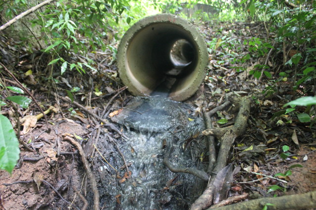 No local a terra já demonstra sinais claros de contaminação e há muitos resquícios de papeis, plásticos e lixos secos. O cheiro e a coloração da água, bem escura, não deixam dúvidas de se tratar de esgoto cloacal.