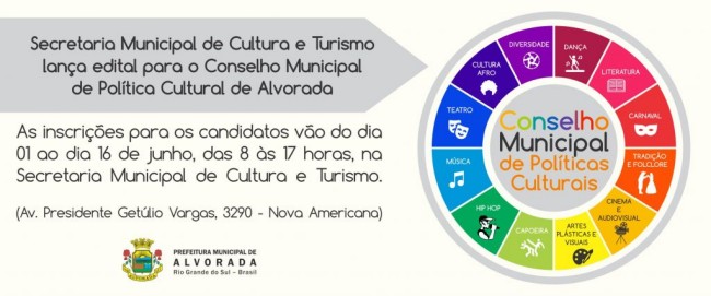 Então quem tem interesse pela cultura da cidade e deseja que ela tome forma e incentivo, e ainda que todos que produzem cultura na cidade possam movimentar mais espaços, este é o momento que precisamos nos fazer presente, porque é agora que serão definidos os membros que irão acompanhar as políticas publicas culturais dentro da cidade de Alvorada pelos próximos dois anos.