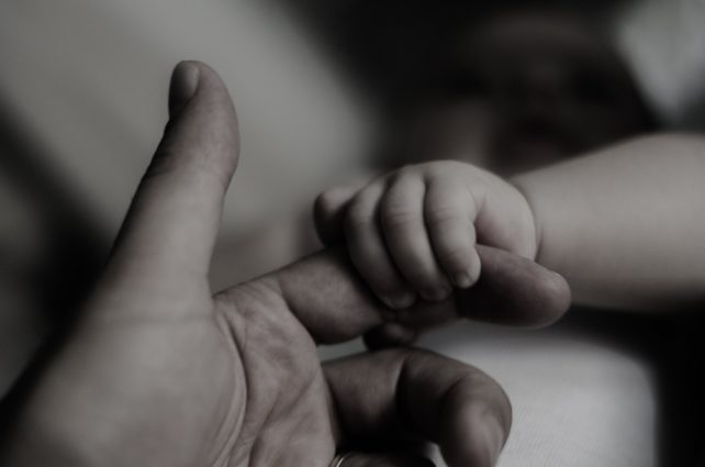 sobre as mãos unidas de pai e filho,