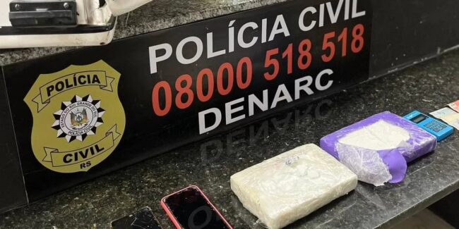 Uma transação de cocaína foi interrompida pelo Departamento Estadual de Investigações do Narcotráfico (Denarc) da Polícia Civil na última quinta-feira (09). Dois tijolos da droga, avaliada em torno de R$ 50 mil, foram apreendidos com dois traficantes no Jardim Algarve.