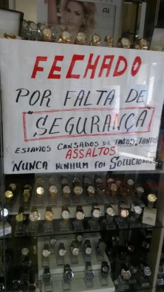 Cansado de tantos assaltos, o proprietário da joalheria Topaze fixou na vitrine de uma de suas lojas um cartaz informando os clientes do motivo do estabelecimento estar com as portas fechadas.