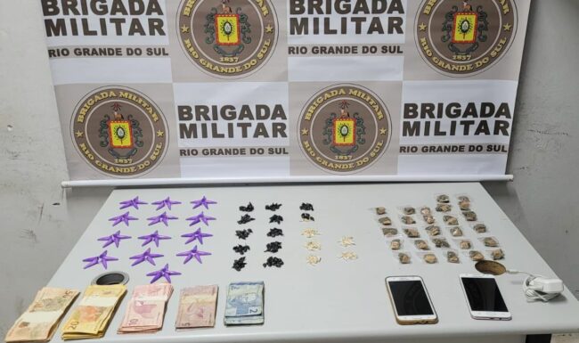 Os suspeitos, de 20 e 16 anos, foram localizado no bairro Nova Alvorada, e com eles foram encontrados 65 pinos de cocaína, 171 pedras de crack, 27 porções de maconha, R$1.025,00 e dois celulares.