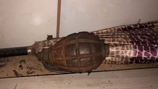 Com os fortes ventos que atingiram a região nos últimos dias, moradores do bairro Maria Regina, ao verificar o forro da casa que havia se desprendido, localizaram um artefato semelhante a uma granada de mão, modelo FRAG MK2, de uso restrito das forças armadas.