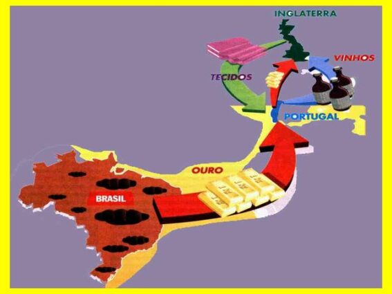 Imagem: Esquema explicativo, muito bom, do Tratado de Methuen: para Portugal, tecidos; para a Inglaterra, vinho e ouro; para o Brasil, evasão do ouro.