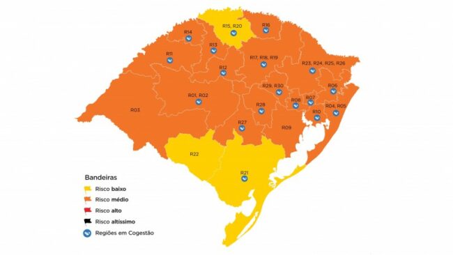 Porto Alegre e as outras 17 regiões seguem em bandeira laranja, ainda podendo optar pelo retorno das atividades escolares presenciais e a liberação de eventos de maior parte com público.