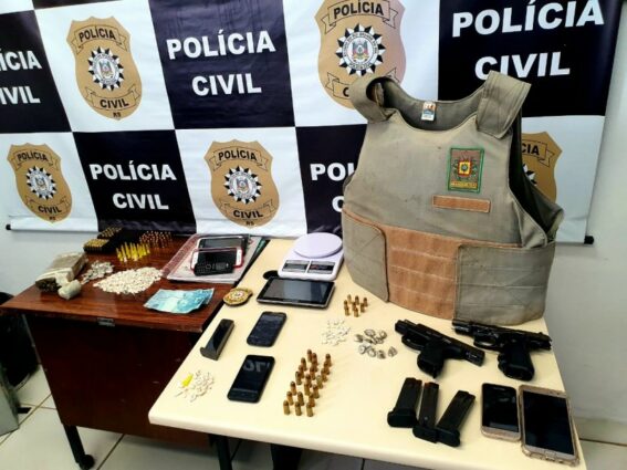 Com o grupo foram encontradas duas pistolas, carregadores de pistola, munições, um colete balístico da Brigada Militar, 522 pedras de crack, 22 pinos de cocaína, 32 porções maconha e um tijolo da droga pensando cerca de 500 gramas.