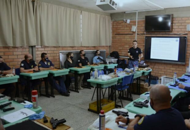 Em cumprimento à Legislação Federal, durante esta semana, dias 8 e 10, a Guarda Civil Municipal (GMC) realizou Curso de Capacitação para manutenção e controle de armas de fogo e munições institucionais. A formação faz parte da grade curricular do Curso de Formação e Capacitação Continuada da GMC de Alvorada e foi motivada pelo recebimento de pistolas .40, carabinas CTT.40 da Taurus.