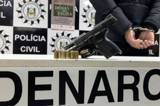 Durante o cumprimento de um mandado de busca e apreensão, um homem de 28 anos, com antecedentes por homicídio, foi preso em flagrante no sábado (16), por porte de arma de fogo. A ação aconteceu no bairro Maria Regina e foi realizada por policiais civis da 4ª Delegacia de Investigações do Narcotráfico do Departamento Estadual de Investigações do Narcotráfico (Denarc).