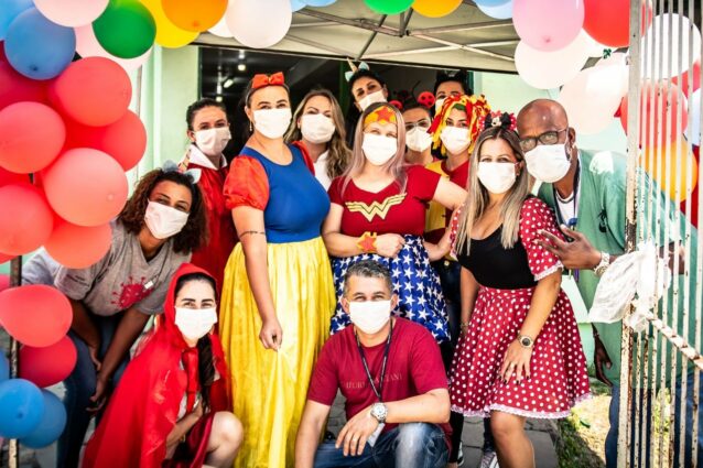 O primeiro dia da vacinação contra a Covid-19 em Alvorada foi de expectativa e alegria. Na quarta-feira (19) as equipes das Unidades Básicas de Saúde (UBSs) estavam preparadas para receber os jovens pacientes e os profissionais do Centro de Vacinação organizaram uma verdadeira festa para a garotada, com balões, fantasias e muita empolgação (foto).