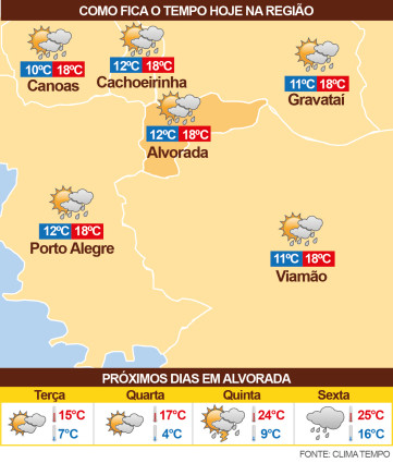 A região Metropolitana terá muitas nuvens e devem ocorrer períodos de chuva e garoa, não se descarta intervalos de melhoria. O dia será ventoso na Metade Leste e em Alvorada terá algumas rajadas fortes. O dia será de frio com o vento trazendo baixa sensação térmica.