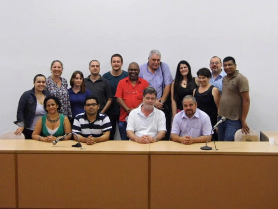 Foto: Reunião dos integrantes do Núcleo de Estudos Africanos e Afro-Brasileiros Vó Tinancia, em atividade com o professor José Rivair Macedo, no auditório da FAPA (2012). Jorge Euzébio Assumpção no centro. Arquivo pessoal.