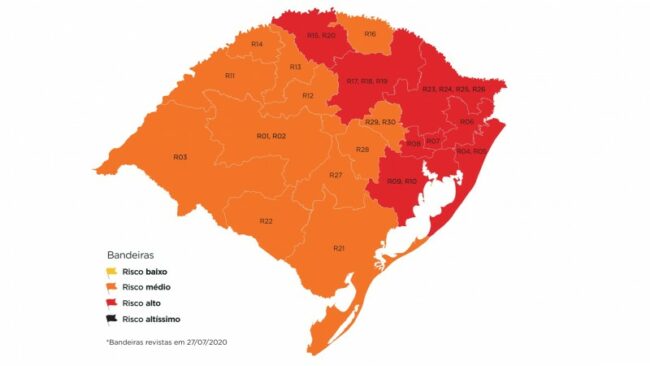 No mapa preliminar que havia sido divulgado na última sexta-feira (24) o Estado tinha 14 regiões com alto risco de contaminação. Após analisar pedidos de reconsideração por parte de municípios e associações, o Gabinete de Crise acatou pedido de seis regiões (Bagé, Cruz Alta, Pelotas, Santa Cruz, Santa Rosa e Santo Ângelo) que voltam à bandeira laranja.