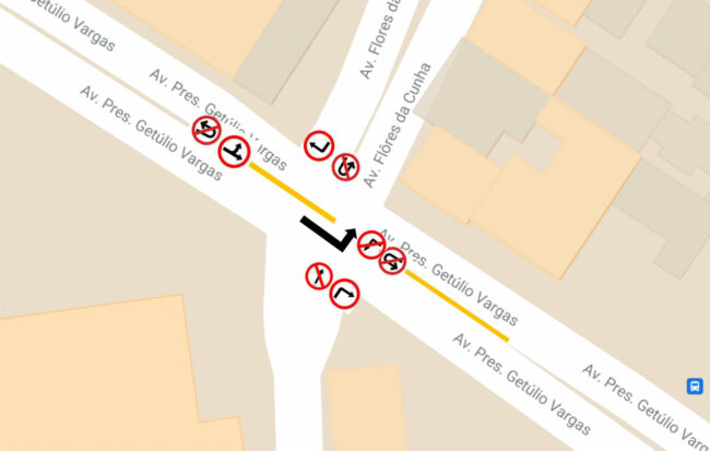 A conversão segue possível para a Flores da Cunha a quem trafega pela Presidente Vargas, nos dois sentidos, ficando vetado atravessar a avenida, seguindo da Flores da Cunha para a Pedro Carneiro Pereira, e vice-versa. Também não é possível realizar o retorno naquele ponto. Confira no gráfico em anexo.
