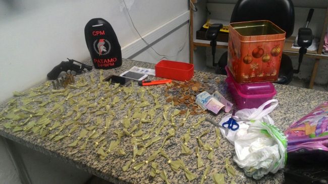 A suspeita fugiu ao avistar a viatura da Patama. Ao ser detida dentro de uma cassa, foi identificada, tendo 45 anos e com antecedentes por ameaça de morte. No local foi encontrado um revólver calibre .38 marca Rossi, municiado com cinco cartuchos intactos, mais seis munições intactas, 107 trouxinhas de cocaína e duas porções grandes cocaína.