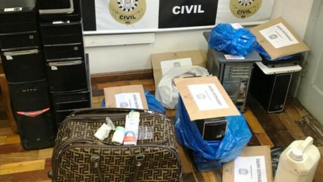 O foco foi buscar documentos e objetos que possam auxiliar na investigação policial. Assim, foram apreendidos 10 computadores, sete notebook, 11 celulares, um simulacro de arma de fogo, um revólver, além de diversos documentos e anabolizante.