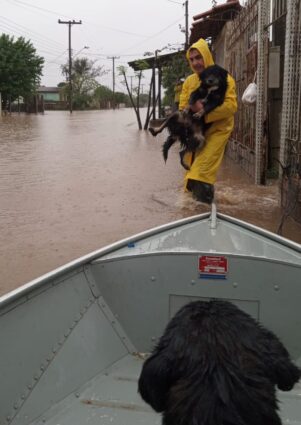 Outra preocupação é com os animais da região alagada. Alguns permanecem com suas famílias, outros foram abandonados e há ainda os de rua. Todos necessitam de abrigo seguro e alimento.