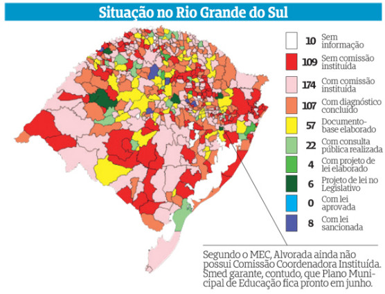 Elaborado pela Secretaria de Articulação com os Sistemas de Ensino (Sase) do Ministério da Educação (MEC), o levantamento sobre a preparação dos planos de educação mostra que um quarto dos municípios brasileiros, 1.441, ainda não começou o trabalho de adequação ou elaboração do documento. Apenas 37 municípios em todo o país já cumpriram todas as fases, até a sanção da lei.