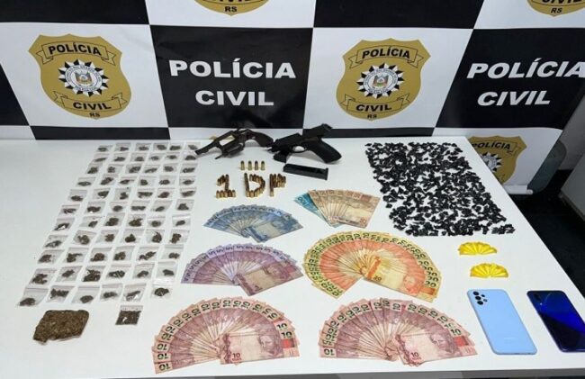 Com os suspeitos foram encontradas porções de cocaína, crack e maconha; além de duas armas, ambas com a numeração raspada e dinheiro.