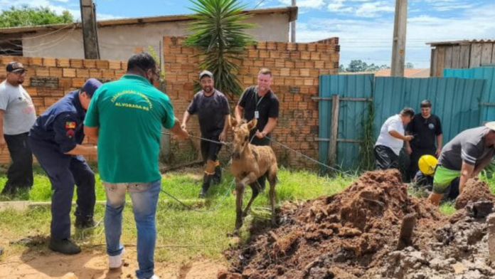 A Secretaria de Obras foi acionada para prestar apoio com o uso de retroescavadeira e caçambas, possibilitando a abertura da área e o acesso seguro até o animal para a realização do resgate.