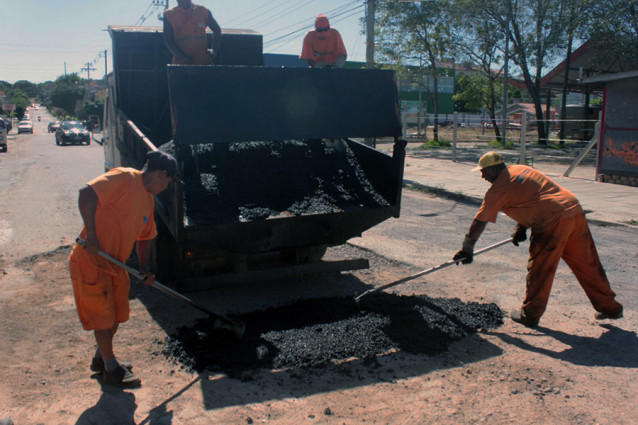 Desde segunda (14), uma equipe da secretaria municipal de Obras e Viação (Smov) realiza o serviço de recapeamento de asfalto a frio.