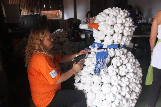 São 10 pessoas que, a partir de centenas de garrafas pets e arames, estão confeccionando diversas peças natalinas há cerca de um mês. São bonecos de neve, guirlandas, anjos, laços, sinos, flores e muitos outros enfeites que receberão iluminação e vão compor, junto com o presépio em tamanho natural, o Natal Luz Ecológico de Alvorada.