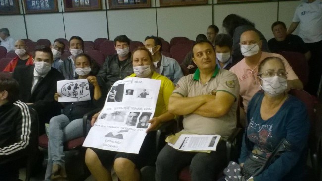 Daniela Antunes estava sentada na galeria com um cartaz de protesto contra a fala do presidente da Casa na sessão anterior de que apenas manifestações silenciosas são permitidas na Câmara. Em protesto, membros do Sindicato dos Servidores Públicos Municipais (Sima) participaram da sessão de hoje com máscaras na boca em alusão a uma “mordaça” imposta pelo Legislativo.