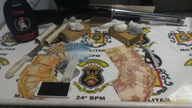 Durante abordagem a um conhecido traficante, este fugiu ao ver a guarnição, sendo perseguido. Acabou detido em uma casa onde havia R$ 1.999,00 em dinheiro; dois tijolos de maconha mais uma porção, no total de 950 gramas; uma bucha grande de cocaína e quatro petecas de cocaína pesando, no total, 62 gramas; 115 pedrinhas de crack embaladas para a venda e mais uma porção de crack para embalar, totalizando 43 gramas; uma espingarda Cal.12, Winchester; balança de precisão e demais materiais para embalar drogas.