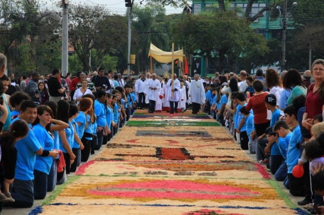 Uma das maiores festas da igreja Católica é celebrada nesta quinta-feira (26). Corpus Christi lembra a instituição da eucaristia, realizada por Jesus no início da era cristã. Na ocasião, cumprindo tradição portuguesa, são confeccionados tapetes com flores e serragem colorida, por onde passa uma procissão.