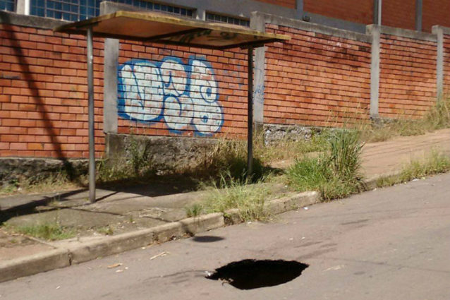 O problema fica em frente à Escola Almira Feijó e à parada de ônibus das linhas Jardim Alvorada e L5 e surgiu no início de 2016.