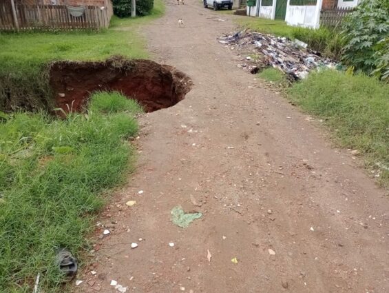 A cratera sobre o curso de água que atravessa a rua aumentou de tamanho e o acúmulo de lixo é ainda maior.
